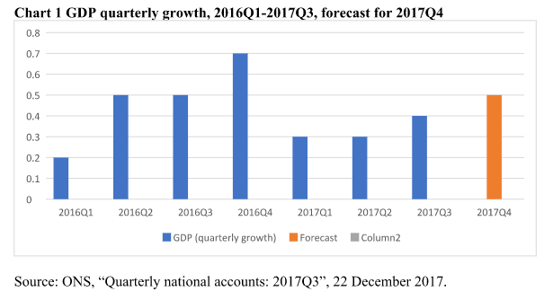 In an interview for the new edition of the New Statesman, Robert Chote – who chairs the Office of Budget Responsibility (OBR) – has entered the murky waters of blaming the Brexit vote for “harming growth”, claiming the economy is “weak and stable, rather than strong and stable”. He asserts that “…in terms of the net effect on GDP, the hits to demand have outweighed the boosts”. But truth to tell, this may, or may not, be true. Clearly, we do not know what would have happened to the economy if there had been no Brexit vote in June 2016 – we do not know the counterfactual. Granted, the OBR produced forecasts back in March 2016, which suggested GDP growth would be 2.0% for 2016 (outturn currently estimated to be 1.9%) and 2.2% for 2017. Arguably, this is as near as we can get to a no Brexit-vote counterfactual picture. Current expectations are for 1.8% growth in 2017 (we will know the ONS’s first estimate on Friday 26th January, which will probably be revised up subsequently) which is, arguably, not a million miles from the OBR’s March 2016 forecast. But there is more. All economic forecasters, not least of all the OBR, know that economic forecasting is an imprecise art. Indeed, since the Brexit vote the OBR’s forecasts for GDP growth for 2017 have, to put it kindly, fluctuated. In November 2016 gloom descended and they downgraded their growth forecast to show 1.4% for 2017, they then revised it up to 2.0% in March 2017, as the economy seemed to weathering the Brexit vote well, and then revised it down to 1.5% in November 2017. I respect the OBR, but may I humbly suggest that with such a forecasting record, caution and modesty should be the order of the day. Economic models can only tell us so much about the way the economy functions. More constructively, let us analyse what has actually happened to the economy over the last two years. GDP growth in the 2016 Q1 was poor (see chart 1 below), but it perked up in 2016 Q2 and through the second half of 2016. How much the strength in the second half had to do with the Bank’s premature easing of monetary policy in August 2016 is subject to much speculation, but my speculation is that, overall, it was fairly modest. The economy had momentum in the middle of 2016 and the labour force was robust. Granted, the economy showed weaker growth in the first half of 2017 as household consumption growth weakened significantly, doubtless reflecting the squeeze on real earnings following the post-Brexit vote depreciation of the currency and the subsequent rise in inflation. (And I suspect some residual seasonality in the figures, there seems to be a pattern of weak first quarter data.) This is all understood. Consumption did, however, pick up in the second half of the year. Meanwhile gross fixed capital formation (capital investment) remained solid in 2017 in spite of fears in some quarters that a Brexit vote would lead to a “collapse”. And, of crucial importance, net exports (a vital component of GDP) have shown some improvement, with exports benefiting from the (much-needed) more competitive currency and a pick-up in global growth (which has been much as was expected by the IMF prior to the Brexit vote). In 2016, the trade balance in goods and services deteriorated, acting as a drag on growth, but in 2017 the turn-round in the trade balance should contribute to growth. Arguably, the currency was overvalued prior to the vote, doubtless supporting household consumption but to the detriment of the external sector. And economic growth in 2017 can be seen as in a post-depreciation adjustment phase, achieving a much-needed and long overdue rebalancing from the household sector to exports. Now, we can argue until the cows come home as to whether Brexit’s “hits to demand” have outweighed the “boosts”. Perhaps they have, perhaps they haven’t. To repeat, we don’t know what would have happened if there had been no Brexit vote (perhaps household consumption would have slowed in any case?), and we never will. But one thing is fairly clear, economic growth now seems to be better balanced than it was when the currency was overvalued. There are two other points to make. Firstly, I am not claiming that the economy is problem–free. Analysts are rightly concerned about the weak productivity growth since the Great Recession, though with plentiful labour resources it is hardly surprising that employers favoured labour-intensive means of production (hence poor productivity growth). As the labour market tightens, the unemployment rate is now down to 40-year lows and net immigration is slowing, employers will have to switch to other ways in order to grow their businesses – and productivity will rise. And, secondly, rightly or wrongly, Mr Chote’s comments risk being seen as political and, more specifically, a continuation of the dreaded “Project Fear”, which lurked the land prior to the referendum and has done so much to undermine people’s trust in seriously important institutions, including HM Treasury. It is worth remembering the Treasury’s scandalous “analysis” of the immediate impact of a Brexit vote, released in May 2016. May I conclude by quoting some highlights? “The analysis in this document comes to a clear central conclusion: a vote to leave would represent an immediate and profound shock to our economy. That shock would push our economy into a recession and lead to an increase in unemployment of around 500,000, GDP would be 3.6% smaller, average real wages would be lower, inflation higher, sterling weaker, house prices would be hit and public borrowing would rise compared with a vote to remain”. “The analysis also presents a downside scenario, finding that the shock could be much more profound, meaning the effect on the economy would be worse still. The rise in uncertainty could be amplified, the volatility in financial markets more tumultuous, and the extent of the impact to living standards more acute